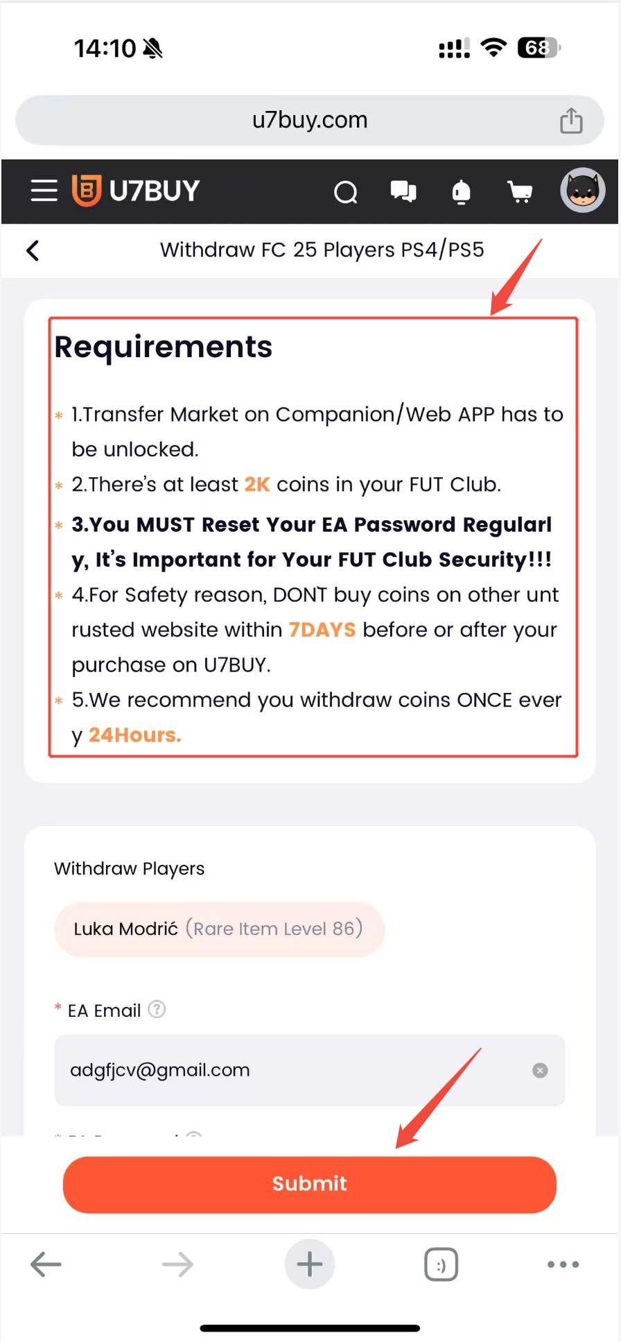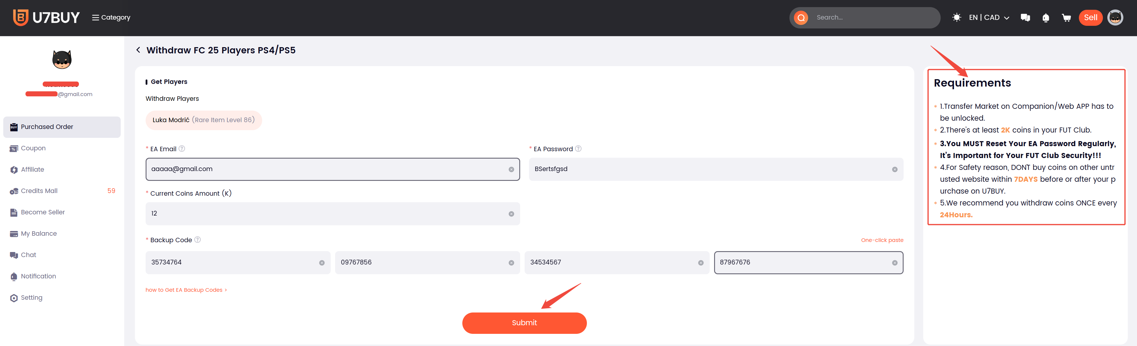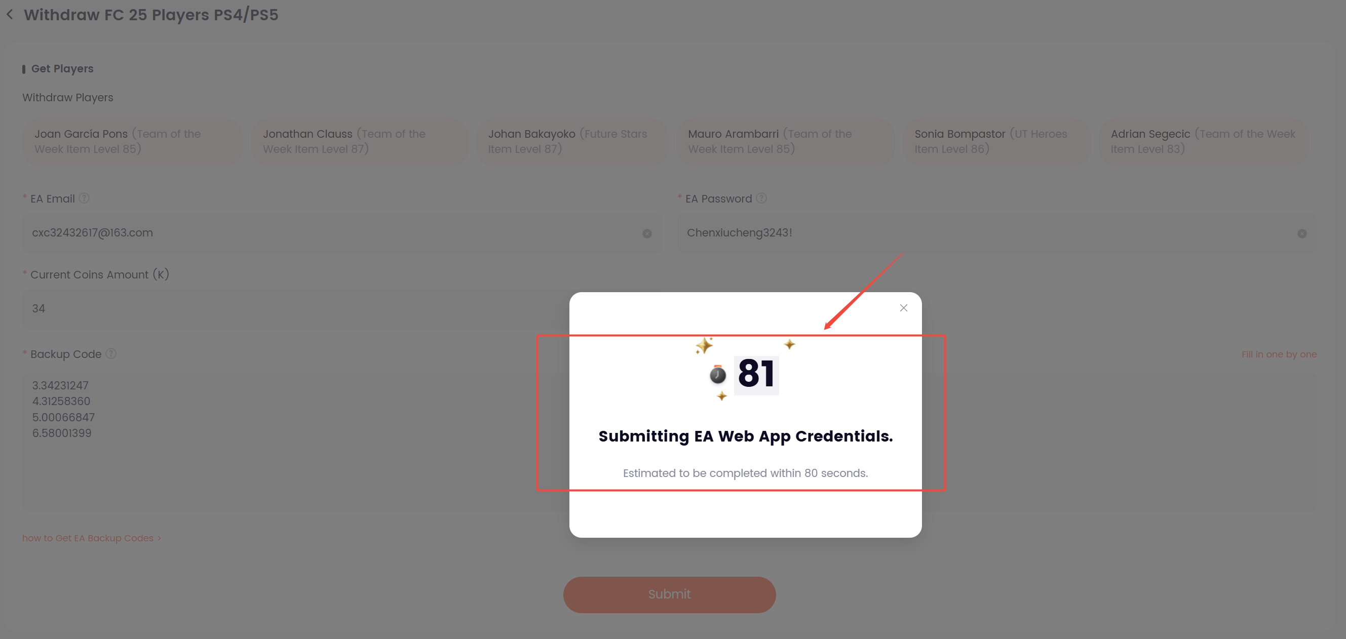 4. Submit the EA account details and wait for a while, keep an eye on the verification status, just in case there is anything wrong, if there is something wrong indeed, follow the tips and then try to "Get Coins/Players" again after you fix it.
