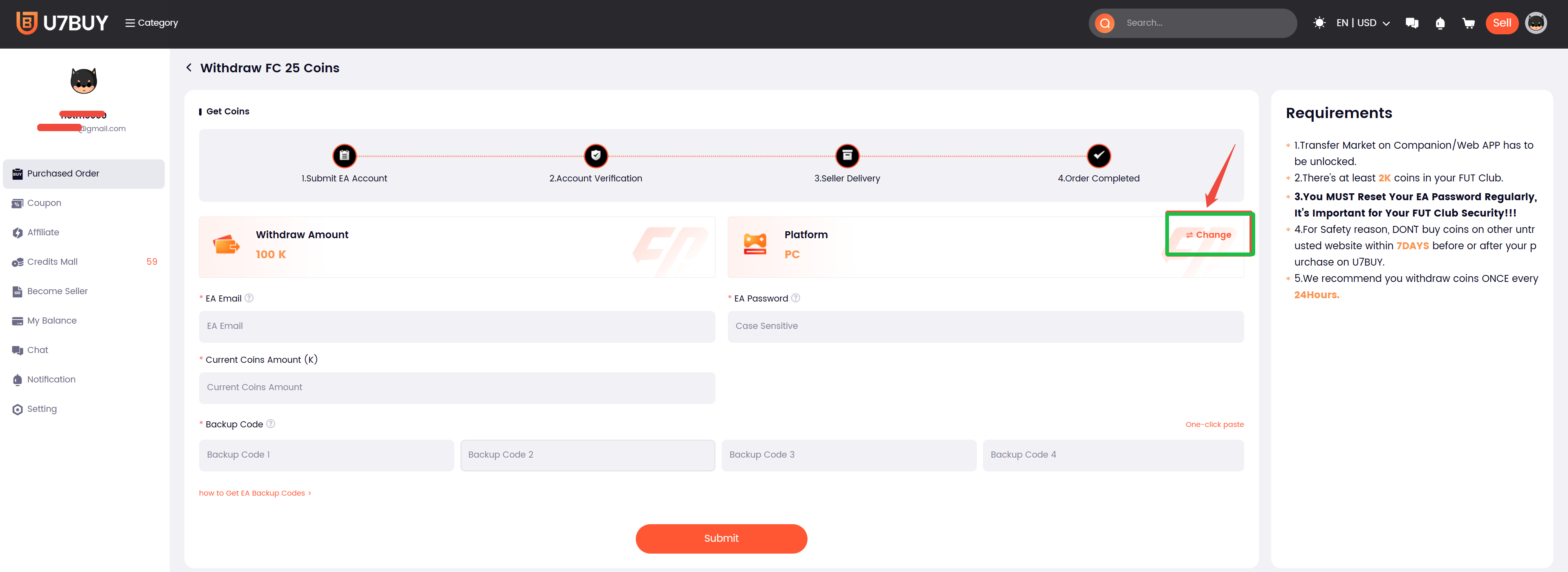 3. Choose the correct platform you actually play FC26 on, check the amount of coins and then click on it. Besides, the amount of coins you receive is calculated based on the current price on U7BUY.