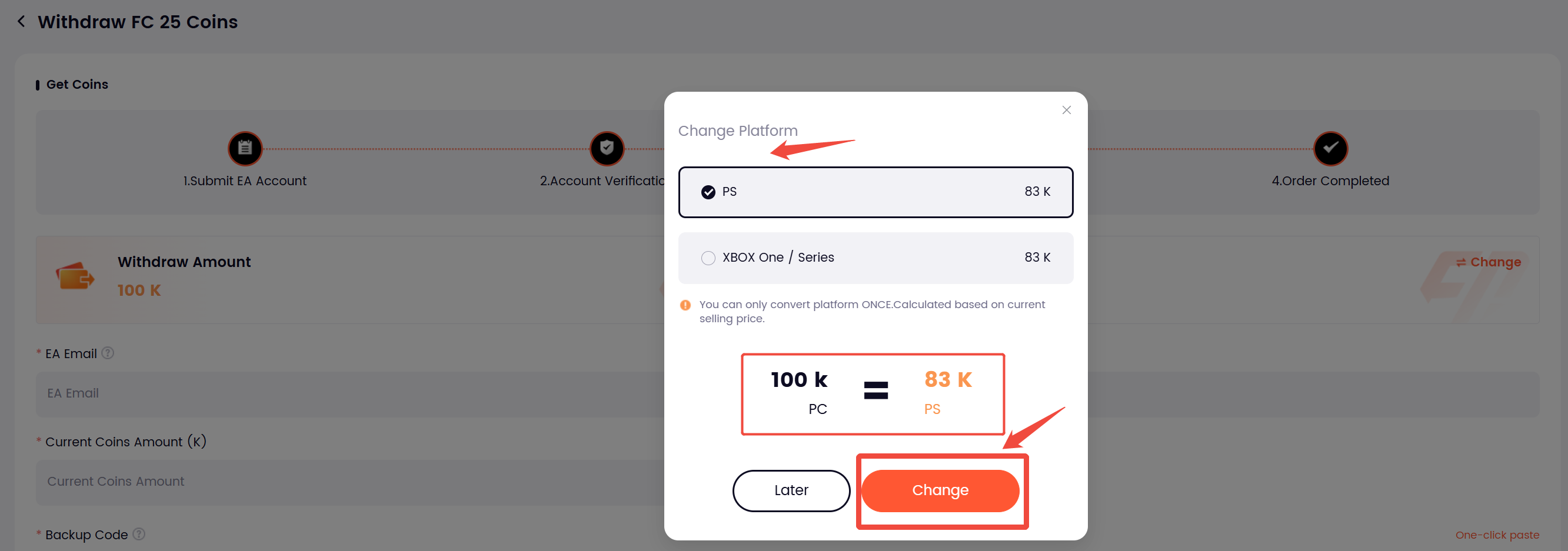 Note: You can only change the platform once for an order, and the amount is calculated based on current price.