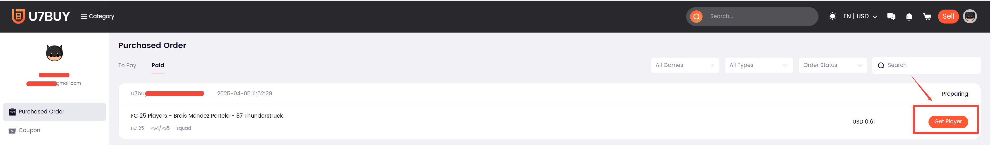 1. Find the order in your U7BUY member account, click Get Coins/Players